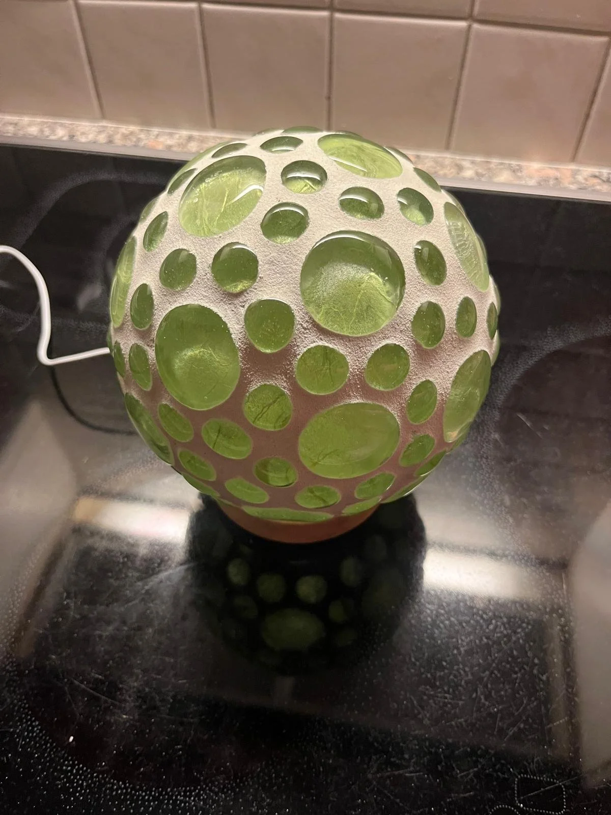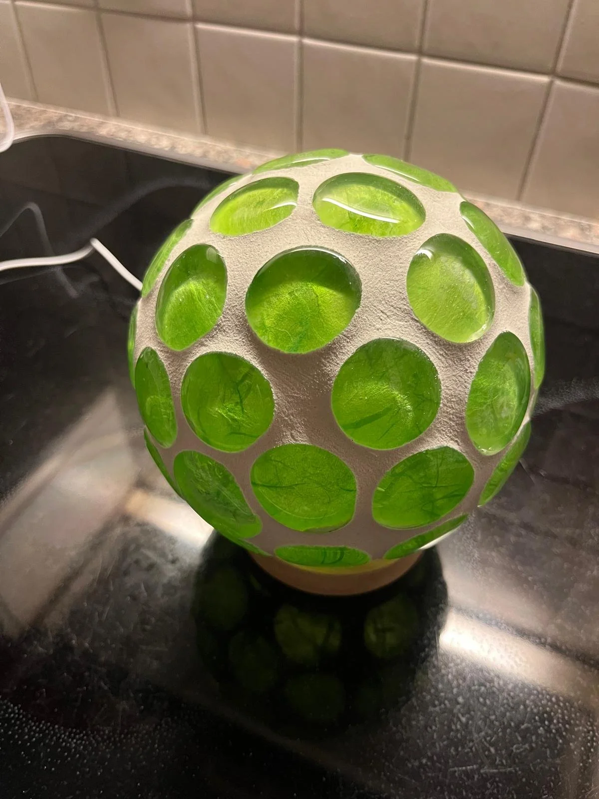 Jede Leuchtkugel ist mit Glassteinen und/oder Mosaiksteinen veredelt. Darin befindet sich eine Lichterkette (Batterie). Diese kann beliebig ausgewechselt werden.